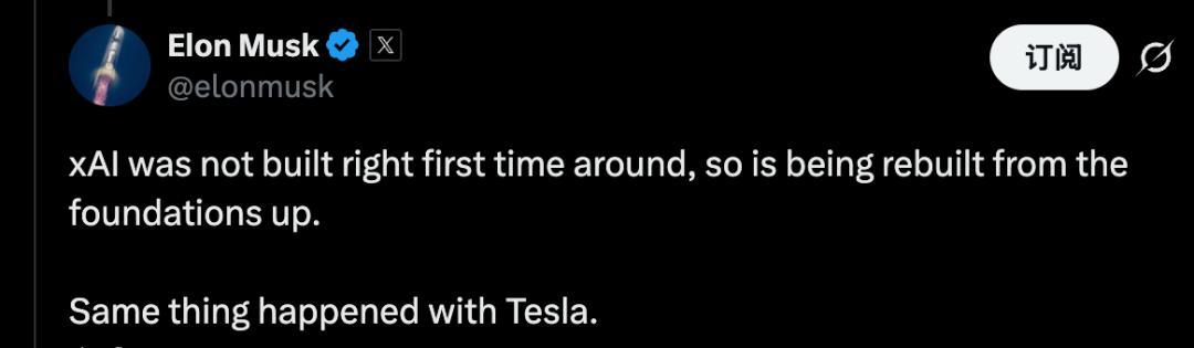 马斯克本东说念主切身回复:xAI第一次没建对,当今要重新再建。
