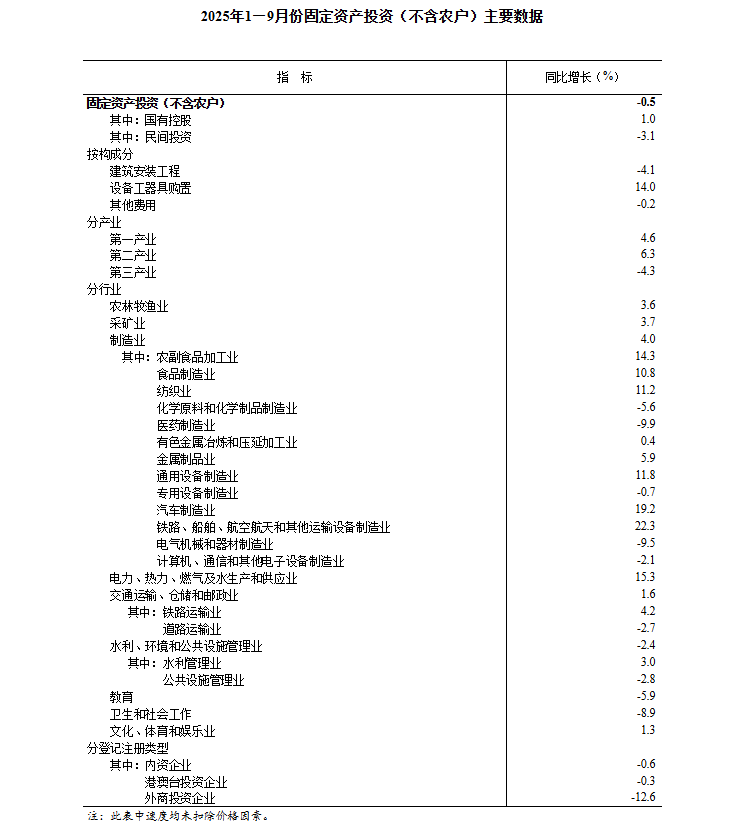 10月20日,国度统计局发布2025年1~9月份寰宇固定财富投资基本情况,2025年1~9月份,寰宇固定财富投资(不含农户)371535亿元,同比着落0.5%。其中,民间固定财富投资同比着落3.1%。从环比看,9月份固定财富投资(不含农户)着落0.07%。